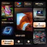 Η τεχνολογία Mini LED παρέχει ανώτερη φωτεινότητα και αντίθεση, ενώ η υποστήριξη HDR10, HDR10+, Dolby Vision και AI Picture βελτιώνει την ποιότητα εικόνας, κάνοντάς τη ιδανική για ταινίες και παιχνίδια.