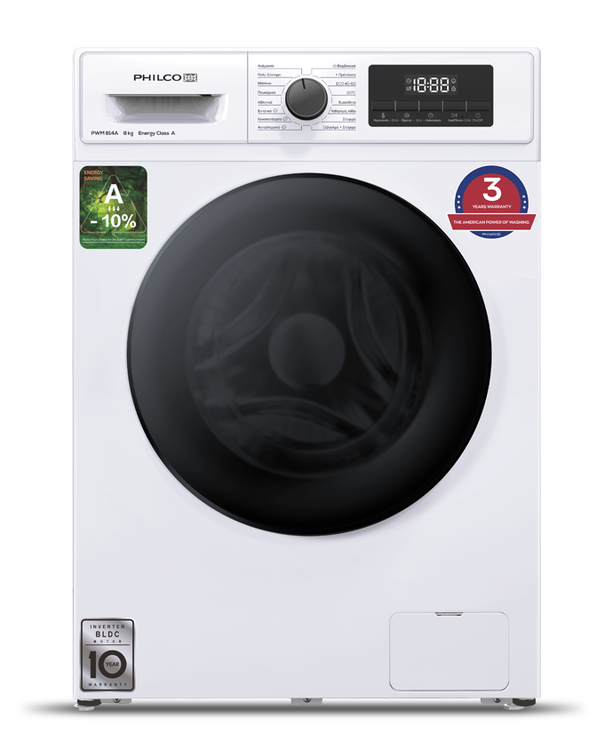 Σας παρουσιάζουμε το νέο 8κιλο πλυντήριο ρούχων PHILCO με μοτέρ inverter τεχνολογίας SMART BLDC με 10ετή εγγύηση, για εξοικονόμηση ρεύματος και χαμηλή ένταση θορύβου. Διαθέτει κάδο Honeycomb Crystal Drum για εξαιρετικά αποτελέσματα στην καθαριότητα με ταυτόχρονη προστασία των ρούχων. Η λειτουργία ΑΤΜΟΥ προσφέρει απολύμανση και καθαρισμό ακάρεων για αποστειρωμένα ρούχα. Με αυτόματο υπολογισμό της σωστής ποσότητας νερού και χρόνου πλύσης, βάσει του βάρους φορτίου και του επιλεγμένου προγράμματος και δυνατότητα προσθήκης φορτίου, κατά τη διάρκεια της πλύσης, για να μην μένει ούτε ένα ρούχο άπλυτο. Υπερέχει της κατηγορίας Α των υπολοίπων πλυντηρίων με 10% λιγότερη κατανάλωση ενέργειας.